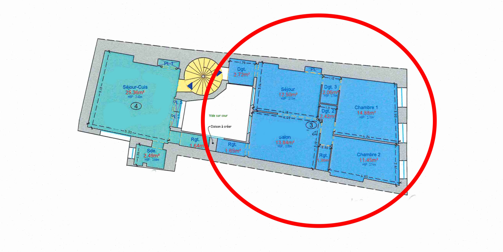 Au 1er étage d'un immeuble ancien en copropriété, un appartement T3 à rénover complètement d'environ 62.82 m².