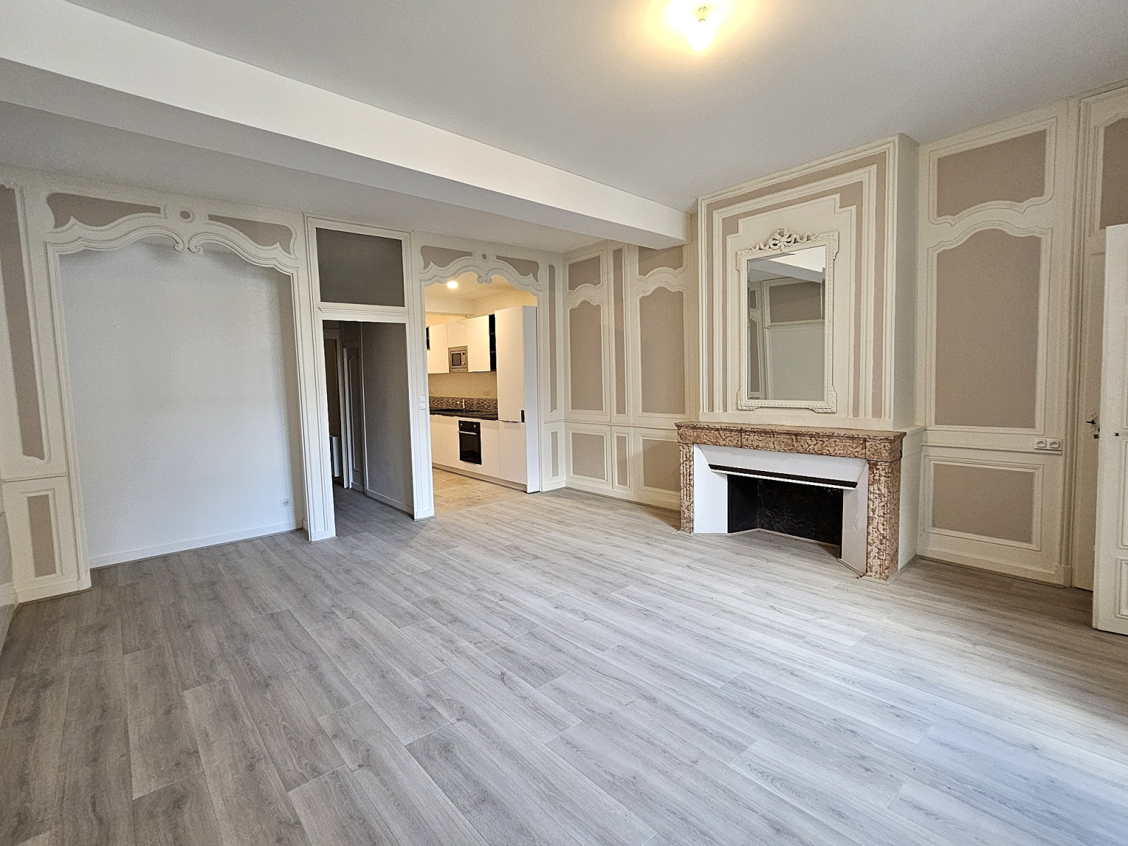 Un duplex de 144.32 m² comprenant au premier étage de l'immeuble : une entrée, un séjour ouvert sur une cuisine équipée, un salon (ou troisième chambre), une salle d'eau, w-c séparé.